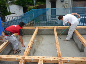 基礎コンクリートが終わり、しっかりした土台が完成したあとは土台敷きという作業です。