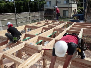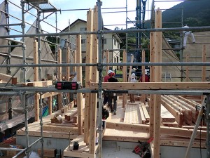 木造住宅の建設工事が進み、梁や柱などの骨組みをつくっていきます。