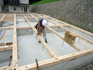 基礎コンクリートが終わり、しっかりした土台が完成したあとは土台敷きという作業です。