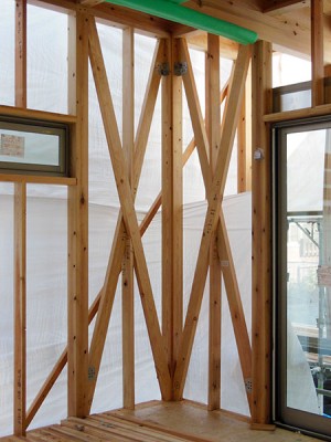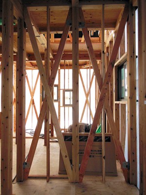 筋違とは、柱、梁、桁などで四辺形に組まれた軸組の中に斜めに入れ地震などに耐えられるようにした補強材のことです。