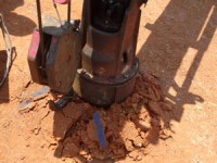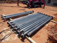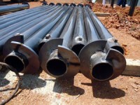 鉄製の鋼管杭をねじ込んで、周りの地面との摩擦力で建物を支えます。