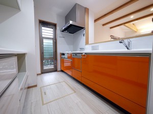 リビングから見える奥様こだわりのキッチンは、明るいオレンジが使われ、