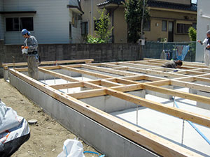 基礎の工事が終了しますと、木工事に移ります。土台敷きは木工事の初めの工程になります。