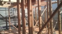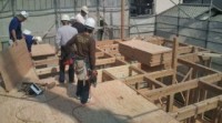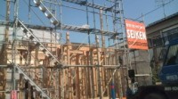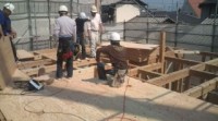 木造住宅の建設工事が進み、梁や柱などの骨組みをつくっていきます。