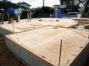 基礎の工事が終了しますと、木工事に移ります。土台敷きは木工事の初めの工程になります。