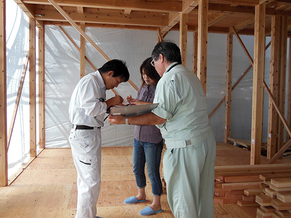 電気配線の打ち合わせは施主様が使いやすいように、図面上だけではなく実際の現場で行います。