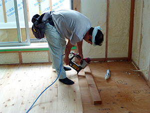 須惠町N様邸の幸せづくり状況:床工事♪ 須惠町N様邸の床工事の様子です♪ フローリングの無垢材を一枚一枚丁寧に敷きつめていきます。 肌と直接触れ合う床は、大事にしたいですよね!! タグ: 須惠町N様邸の幸せづくり状況:床工事♪