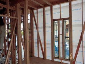 古賀市日吉O様邸の防水工事の様子です♪ 防水工事中です♪ この上に外壁工事を行います。 内側から見た様子です♪ シートと木材の間に断熱をし、お部屋を涼しく、温かくしていきます♪ そしてサッシも取り付けました!!
