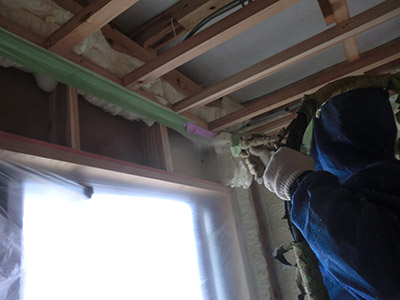 大刀洗町 B様邸の吹きつけ断熱の様子です! 吹きつけ断熱工事の際、セイケンハウスでは、アイシネンを使用しています! アイシネンは驚異的な発泡力で住宅のありとあらゆる隙間に充鎮し、しっかりとした断熱層を形成します! 断熱材...
