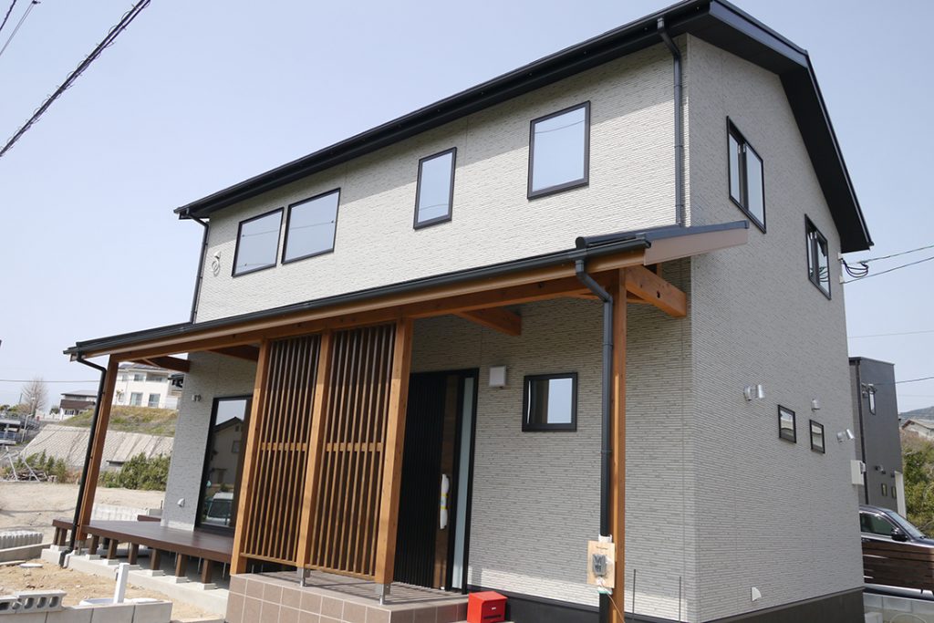 宇美中央1号地K様邸の幸せづくり状況です♪ 完成しました! 大きな窓と木の格子が落ち着いた雰囲気を創り出していますね(*’▽’)